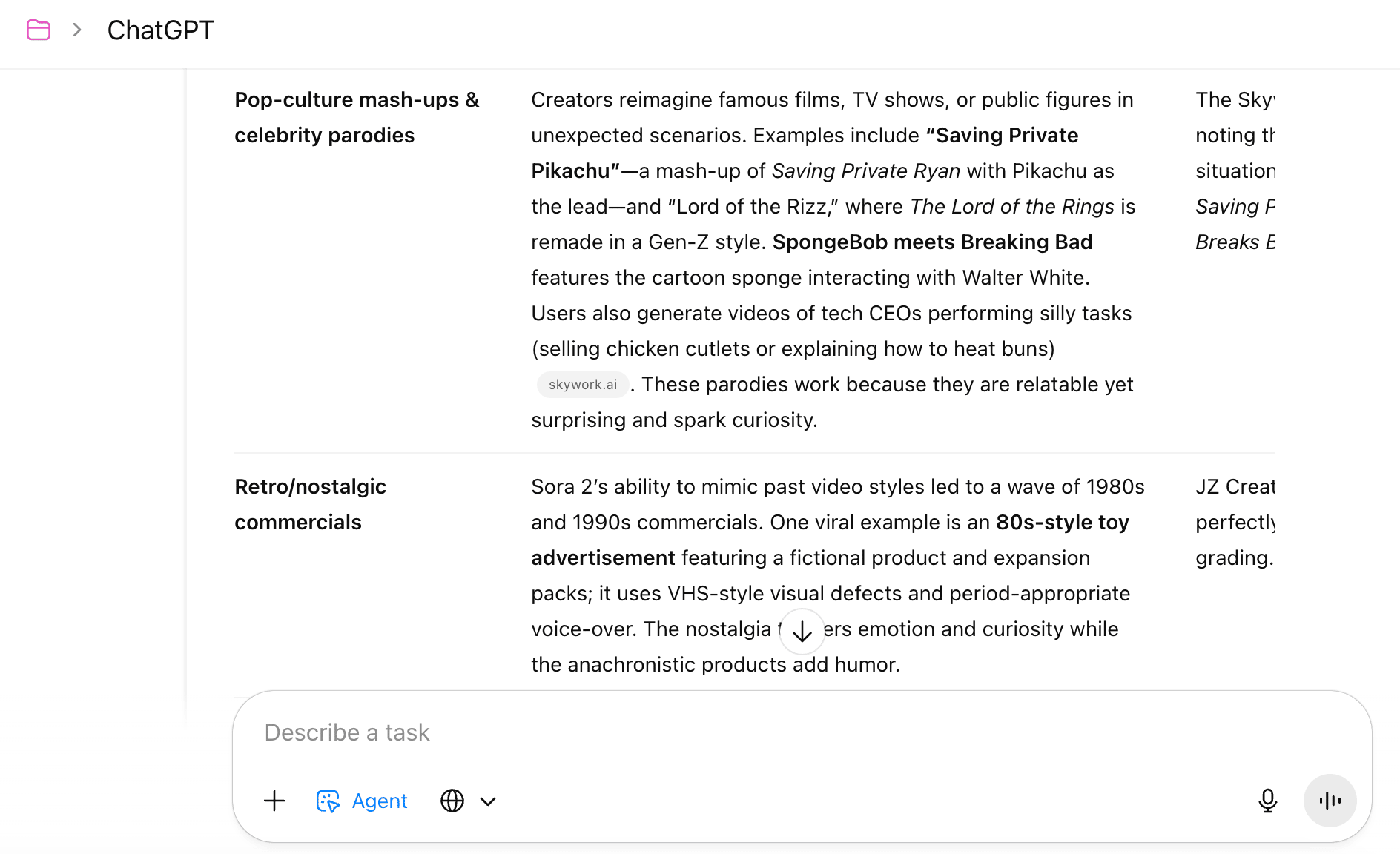 🚀 3 Ways to Create Sora VideosEnough of the boring stuff lol here are some helpful tips you can use to create Sora videos: Tip 1: Remix Existing VideosGo to the explore tab, find a video you like, click remix, then scroll left to find the original. Copy that prompt into ChatGPT and ask it to repurpose the prompt using your Cameo and something relevant to your niche. Example Prompt: "I'm going to provide a Sora 2 prompt and I want you to repurpose it using my cameo and something that's relevant to me [Insert Sora Video Prompt]." Tip 2: Repurpose Your Existing ContentTake existing content (YouTube videos, podcasts, blog posts, etc.) and feed the transcript into ChatGPT. Ask it to generate 3 Sora prompts based on recurring themes in your content. This creates videos that match your actual voice and style. Example Prompt: "I want you to generate 3 video prompts for Sora 2 based on [Insert Your Content] I provide. Keep in mind these videos are only 10 seconds long so you must grab someone's attention instantly with a good hook." Tip 3: ChatGPT Agent Mode (More Advanced)You can also use ChatGPT Agent mode to research trending Sora videos across the internet, identify patterns, then generate prompts tailored to your niche. I tested this method and it researched recurring themes (pop culture mashups, retro commercials), then created custom prompts for my niche. You can also use Perplexity for this same research approach. Example Prompt: "I want you to research the Internet and find trending/viral Sora 2 videos and look for reoccurring themes. Keep in mind these videos are only 10 seconds long right now so you must grab someone's attention instantly with a good hook. Come up with 3 video ideas to start and include the prompt for each one. Also keep in mind my niche is [Insert Niche]." 🤐 My Brutally Honest Take on Sora 2I'm going to be real with you here because this needs to be said. From a technology standpoint, Sora 2 is incredible. It's faster, crisper, realistic, and WAY better than Sora 1. But in my honest opinion - Sora is a net negative for society overall. Here's why I believe this: 1. There is not one benefit that comes from people doom scrolling AI-generated videos on a social media app.