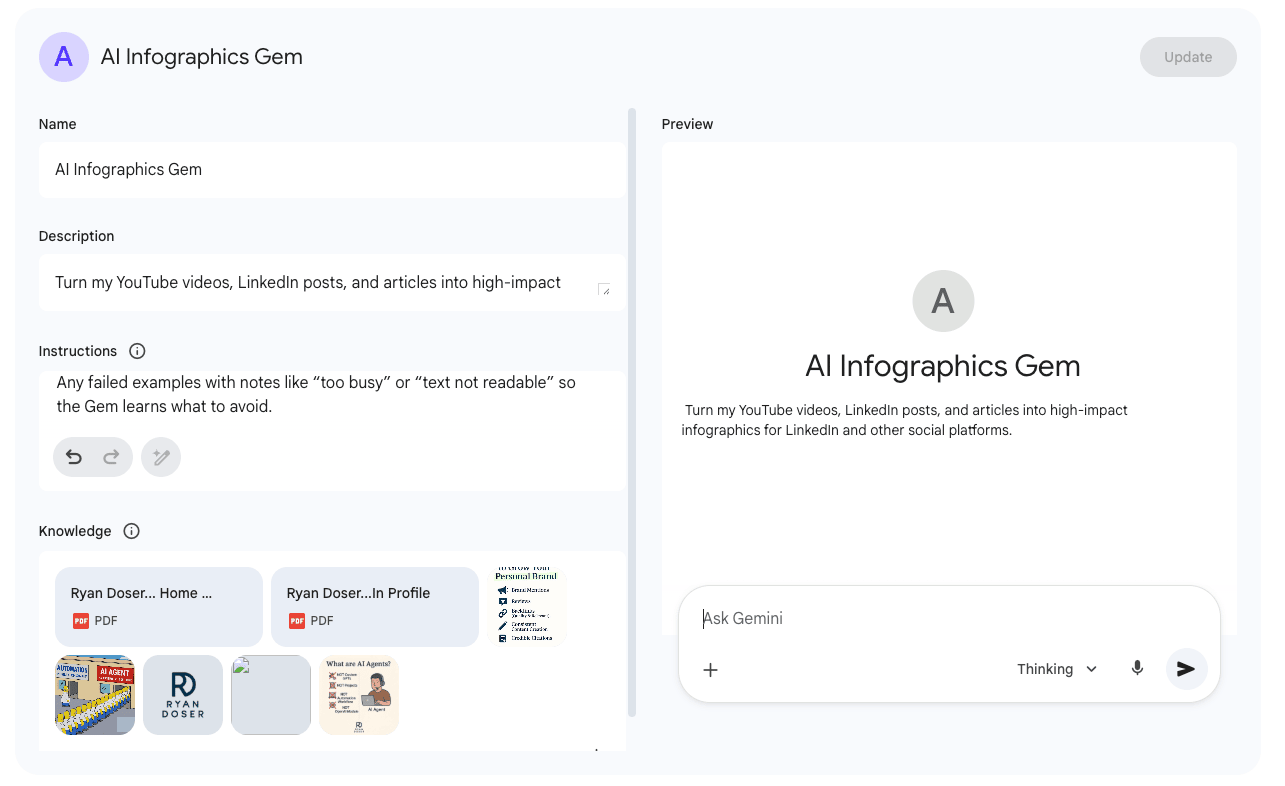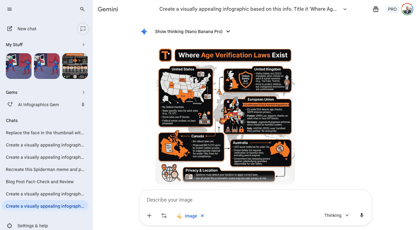 π 5 Real World Use CasesBelow are some real-world use cases of Nano Banana Pro for Marketing & Content Creation that I'm using: Use Case 1 - Professional InfographicsI needed to create a branded infographic for a client. I uploaded my logo, provided the relevant information, and it created a professional infographic with perfect text placement and branding. This one amazed me in one shot... Prompt Example: 'Create a visually appealing infographic based on the info I provide. Title it '[Insert Title]' and put this text on the top center. I've attached my logo for branding reference. [Insert Info]' Use Case 2 - Social Media GraphicsI wanted eye-catching social media content, so I asked Nano Banana to create a 3D isometric city scene with real-time weather data. It pulled current weather from Google Search and created a shareable graphic! Prompt Example: 'Present a clear, 45Β° top-down isometric miniature 3D cartoon scene of [Insert City] featuring its most iconic landmarks and architectural elements. Use soft, refined textures with realistic PBR materials and gentle, lifelike lighting and shadows. Integrate the current weather conditions directly into the city environment to create an immersive atmospheric mood. Use a clean, minimalistic composition with a soft, solid-colored background. At the top-center, place the title β[Insert City]β in large bold text, a prominent weather icon beneath it, then the date (small text) and temperature (medium text). All text must be centered with consistent spacing, and may subtly overlap the tops of the buildings.' Use Case 3 - YouTube ThumbnailsI uploaded a reference thumbnail and my headshot, then asked it to "replace the face in the thumbnail with my face as exact as possible" while keeping everything else identical. Perfect for creating consistent thumbnail styles without Photoshop. Prompt Example: 'Replace the face in the thumbnail with my face (attached headshot) as exact as possible. Keep everything else the same including text, colors, composition, dimensions, and background. [Attach reference thumbnail and your headshot]' Use Case 4 - MemesI uploaded a popular meme template and asked it to replace specific text while keeping everything else identical. It nailed the text placement, font style, and maintained the original meme perfectly. Prompt Example: "I want you to replace the text of the signs on this image and keep everything else the same. Replace the red sign with '[Insert Your Text]'. Replace the white sign with '[Insert Your Text]'. Keep all other elements identical." Use Case 5 - HeadshotsI wanted professional headshots with different backgrounds for various platforms. I uploaded my headshot and a background image, then asked it to swap the background while keeping my face and posture consistent. Prompt Example: "Change the background of my headshot to the attached image. Maintain consistent lighting and shadows that match the new background. Keep my face, expression, and posture exactly the same. Make it look natural and professional. [Attach your headshot and desired background]" Have you tried Google's Nano Banana Pro yet? Reply and let me know your thoughts! Until next time π«‘ Ryan P.S. I'll be dropping a new Nano Banana Pro video on my YouTube Channel next week so make sure you are subscribed! π New & Trending VideosBe sure to subscribe if you haven't already π€