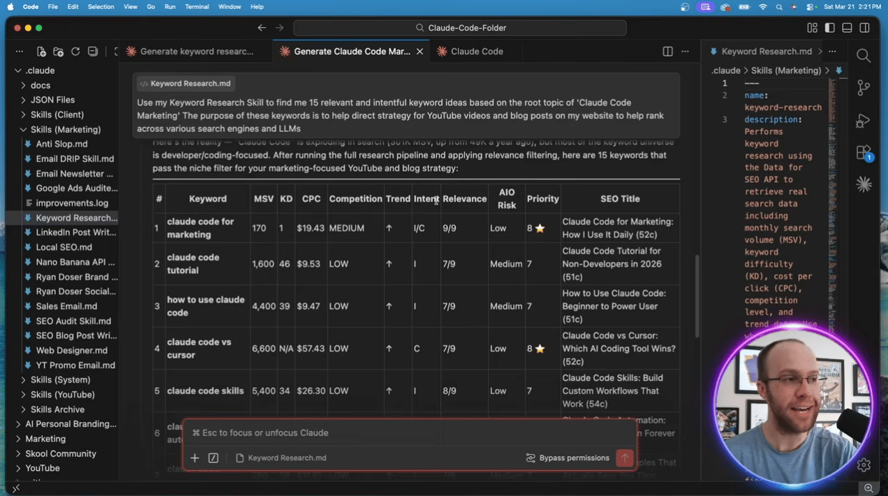 π Want My Actual Claude Code Skills? My Claude Code Skills Stack has 20+ skills I use daily, including the Keyword Research Skill I'm about to show you. A one time fee with lifetime updates. As a bonus I also include setup tips for using Claude Code if you are a beginner. π Grab My Claude Code Skills Stackβ π€« My New Keyword Research SystemAre you spending $100s per month on keyword research tools like Semrush or Ahrefs? Now I love Ahrefs as a holistic SEO tool, but if you're just doing keyword research then these types of tools aren't worth it IMO. I built a keyword research skill inside Claude Code that does the same thing for pennies. I made a full tutorial showing exactly how it works. π ββββWatch: Claude Code Keyword Research Tutorialβ The skill connects to any keyword research API to pull real time keyword data (search volume, keyword difficulty, CPC, etc.) directly into Claude Code. βDataForSEO and Kwrds.ai are great places to start. No dashboard hopping and no $100+ monthly subscription eating your margins. *I also show how to integrate the Ahrefs MCP if you do have a paid subscription like I do. What makes this keyword research process different: