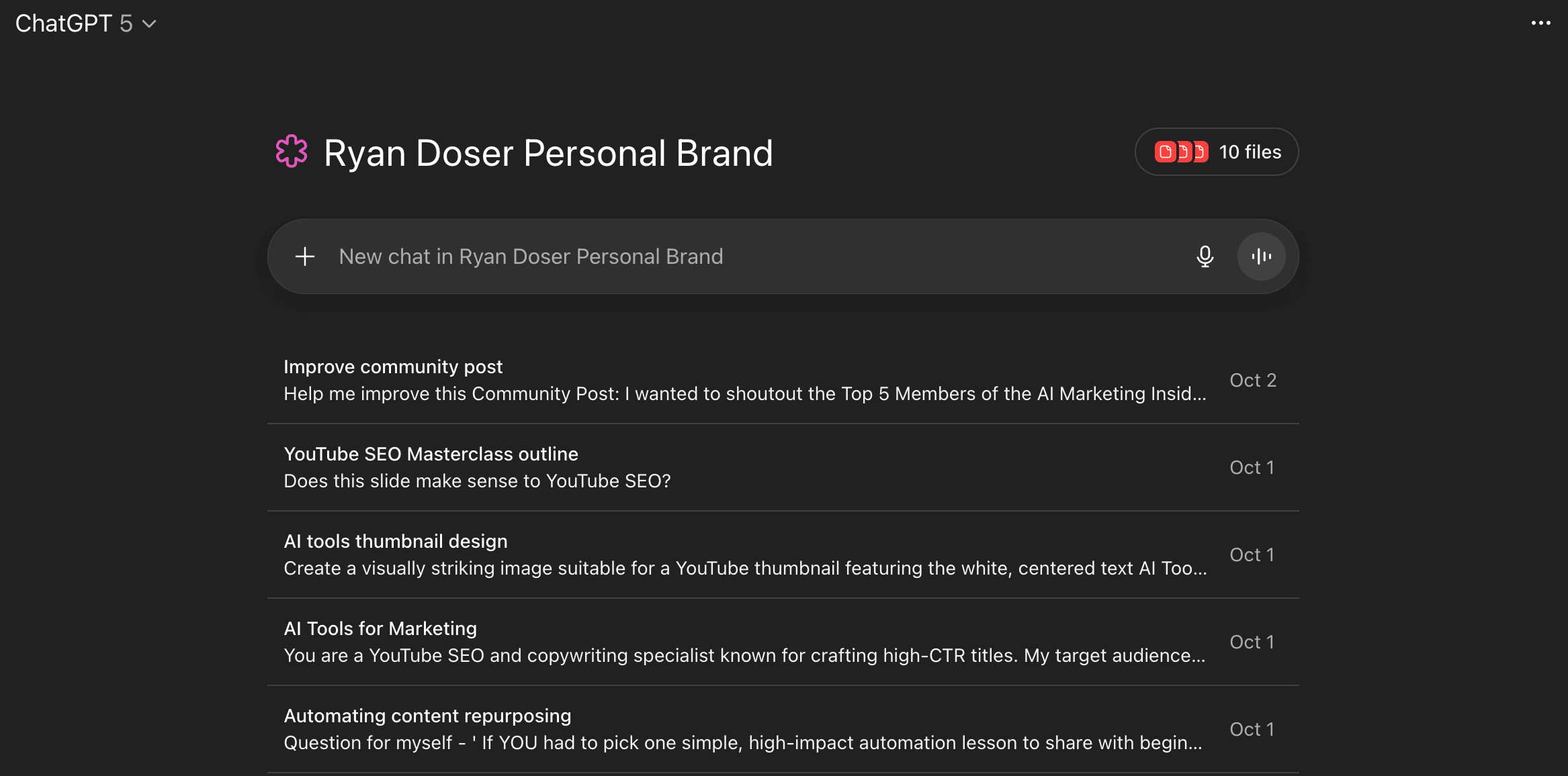 🏆 This week I hit my 2025 YouTube goal of 25K subscribers! I appreciate everyone who's supported my YouTube Channel and I'm keeping my foot on the gas until I hit 100K subs. Be sure to subscribe if you haven't already 🙂 🛑 Stop Using Custom GPTsCustom GPTs are now obsolete in my opinion. I just made an updated comparison video breaking down GPTs vs Projects, and Projects win in almost every category. Custom GPTs were cool when they first launched. But now that free users can build Projects and OpenAI keeps adding features that only work in Projects, there's barely any reason to use GPTs anymore. RIP to the gurus selling Custom GPT courses 💀 If you want to see how I create ChatGPT Projects step-by-step I recommend watching my new ChatGPT Projects Tutorial. Why ChatGPT Projects > GPTsUnless you need to share a GPT across the internet or inside the GPT Store, Projects are superior in every other way for these reasons:
